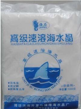 產品信息 優質 速溶 海水晶 養殖專用 產品名稱: 海馬牌海水晶 主要成分:氯化鈉、氯化鎂、氯化鈣、氯化鉀、小蘇打等等 企業標準:Q/0700WQL 001—2014 感觀指標:白色顆粒狀晶體,無明顯外來異物,無異味。 產品等級:工業級 主要用途:各類海鮮的養殖和長途運輸,提高成活率